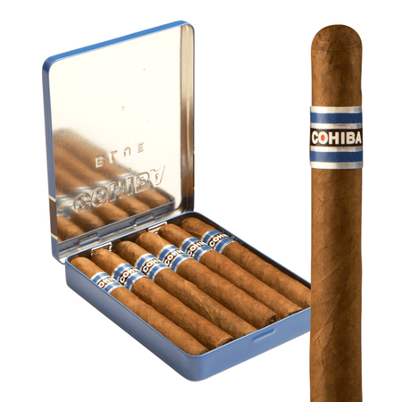 Handcrafted in the Dominican Republic, this petite gem features a silky **Connecticut Shade wrapper** for creamy smoothness and subtle sweetness. It encases a **Dominican binder** and aged **Dominican long-filler** tobaccos, embodying the perfectly balanced blend that defines Cohiba Blue — now presented in a convenient tin of 6 for peak freshness and sophisticated portability.