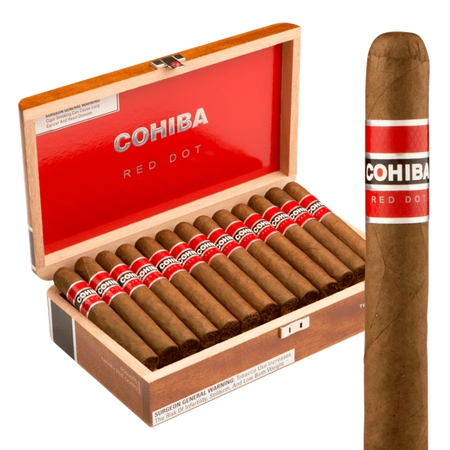 Handmade in the Dominican Republic, this classic features a pristine, oily **African Cameroon wrapper** that imparts distinctive sweet spice and creamy texture. It encases an Indonesian binder and 100% pure Dominican long-filler tobaccos (including aged Piloto Cubano varieties), creating the perfectly balanced blend that has made the Cohiba Red Dot a timeless Dominican icon known for its reliability and widespread appeal.