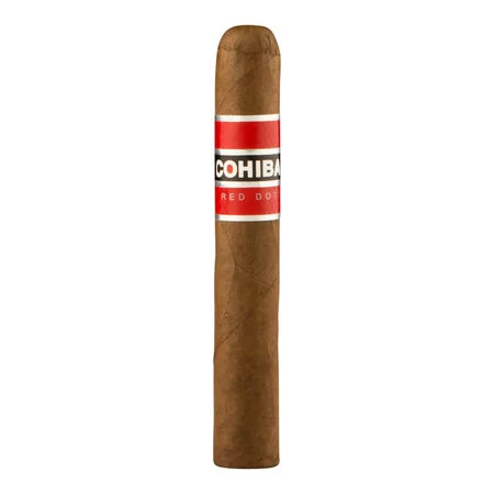Handmade in the Dominican Republic, this classic features a pristine, oily **African Cameroon wrapper** that imparts distinctive sweet spice and creamy texture. It encases an Indonesian binder and 100% pure Dominican long-filler tobaccos (including aged Piloto Cubano varieties), creating the perfectly balanced blend that has made the Cohiba Red Dot a timeless Dominican icon known for its reliability and widespread appeal.