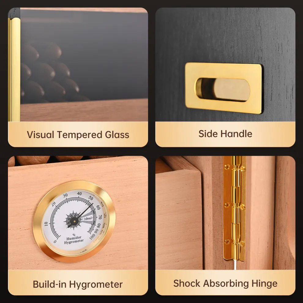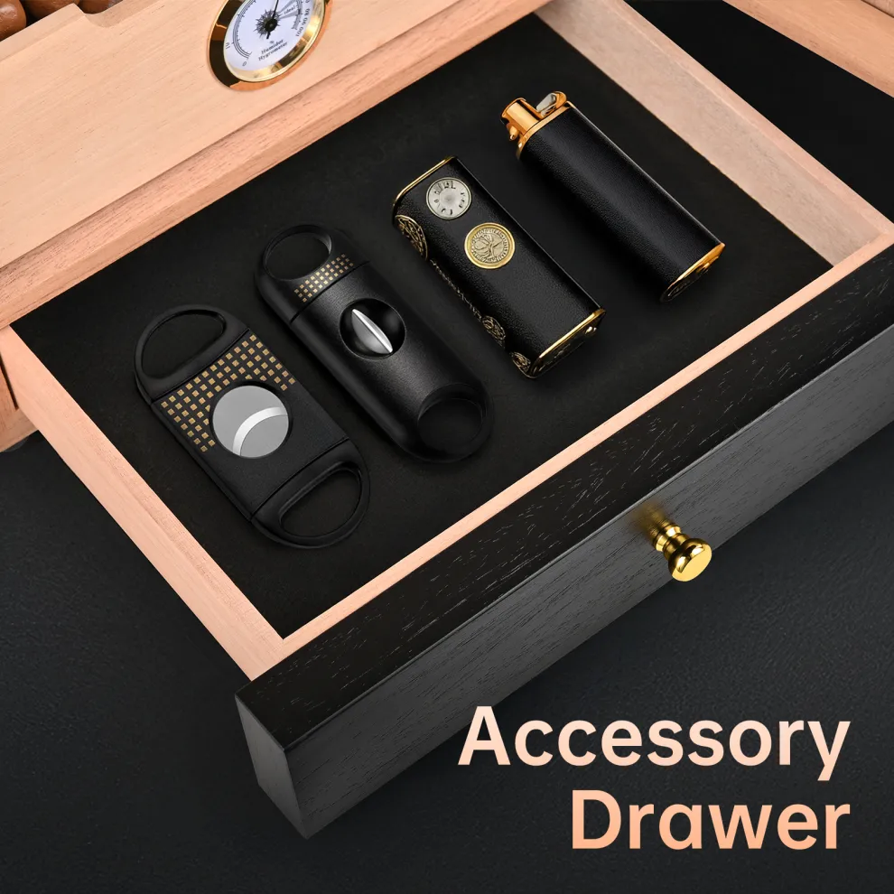 • 【Precise Humidity Control】 Uniquely designed with a dedicated compartment under the drawer for humidity packs, also Come with 3 humidifier release moisture slowly and steadily to ensure that the humidor has sufficient humidity inside. Equipped with an accurate hygrometer, recommended to keep the humidity level between 65% and 75% to keep your collection in optimal condition.
