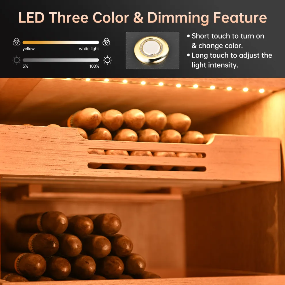 KingChii Cigar Humidor, Light Control System with Spanish Cedar Wood Drawer, Hygrometer, 3 Humidifiers and Cigar Accessories Drawer, for Men, Holds 100 Cigars (Black)