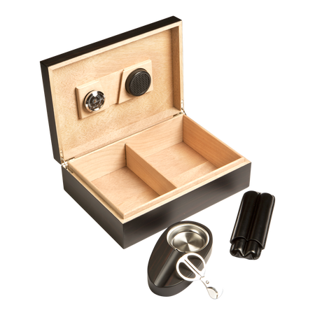 The classy-looking Prestige Davenport Ebony Cigar Humidor comes with a humidifier, hygrometer, matching wood and crystal ashtray, and very sharp cigar scissors. The humidor seals quietly and perfectly airtight, and all of the above accessories are top-notch. This is an outstanding deal if you want to get all of your much-needed cigar smoking accessories in one package, and for a very affordable price.
