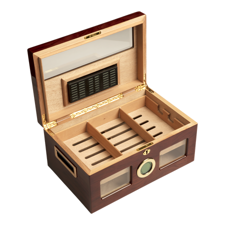 Valencia Digital Cherry Humidor is an affordable storage device with the fit and finish of my other cigar humidor that set me back a few hundred bucks. This contemporary glass top humidor displays up to 120 of my favorite premium cigars in a very elegant way, while the airtight seal keeps them cigar factory fresh. This model also sports an extremely accurate, easy to tune digital hygrometer, and a very capable humidifier.