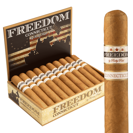 Handmade in Nicaragua, this standout features a smooth, golden-brown **Connecticut wrapper** (often Ecuadorian-grown for creaminess). It encases a **Nicaraguan binder** and aged **Nicaraguan long-filler** tobaccos sourced from Rocky Patel’s own farms, creating the approachable yet flavorful blend that defines the Freedom Connecticut as an everyday essential with patriotic spirit and exceptional quality control.