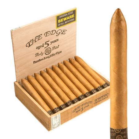 The Edge Connecticut Torpedo combines a silky Connecticut Shade wrapper with Nicaraguan binder and aged Nicaraguan fillers for impeccable construction and balanced medium full complexity. Its classic 6 x 52 torpedo shape concentrates flavors beautifully, delivering layered notes of creamy cedar, leather, nuts, cream, and sweet spice — making it a favorite among aficionados who value refinement and consistent excellence in a premium Rocky Patel format.