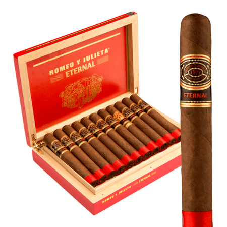 Our staff has found the Romeo y Julieta Eternal Limited Edition Toro to be one of the most elegant and consistently rewarding commemorative cigars in the Romeo y Julieta portfolio. The Nicaraguan Corojo wrapper, selected for this special release, brings profound richness and subtle spice on the cold draw, backed by a Nicaraguan binder and aged Nicaraguan long-fillers. When smoked, the first third opens with roasted espresso, sweet cedar, dark cocoa, and gentle black pepper for a medium-full introduction with creamy texture and rich smoke volume. By the second third, the profile transitions masterfully, deepening into toasted nuts, caramel sweetness, refined leather, and subtle earth while the burn remains cool and even. In the final third, it finishes long and harmonious with lingering sweet dark chocolate, coffee roast, and smooth spice, burning steadily to a solid nub with impeccable ash hold and no harshness. A fitting tribute to Romeo y Julieta heritage in a limited-edition toro format.